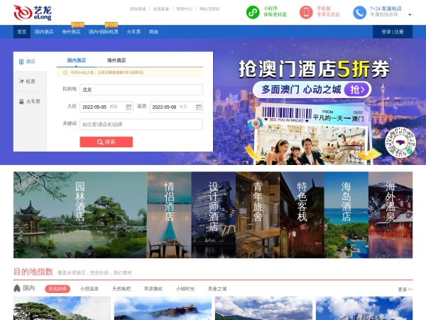 订酒店,用艺龙。订的省心,住的放心, 玩的开心!艺龙旅行作为中国优质的在线旅行服务提供商之一,提供专业的酒店住宿预订、机票、火车票等全方位的旅行产品预订服务,随时随地出发,伴您“艺”起同行!艺龙旅行专注酒店预订近20年,住宿业务覆盖全球超过120万家酒店及非标准住宿,在线支付、到店付任意选;预订酒店优惠享不停,可用红包立减、里程抵现,会员享受折扣再返现,优惠多多,早订早优惠;更有贴心服务伴您安心入住,酒店预订实时确认,到店无房最高赔付首晚房费;还有在线真实用户点评,出行“省时省力不吃亏” !订酒店用艺龙,实惠舒适“艺”起享!