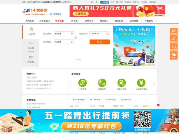 【114票务网】是国内领先12306火车票网上订票平台,提供火车票预订、余票、时刻、票价、车次等查询服务,支持全国火车站代售点12306自取票业务,12306网上订火车票官网是您火车出行的好帮手。