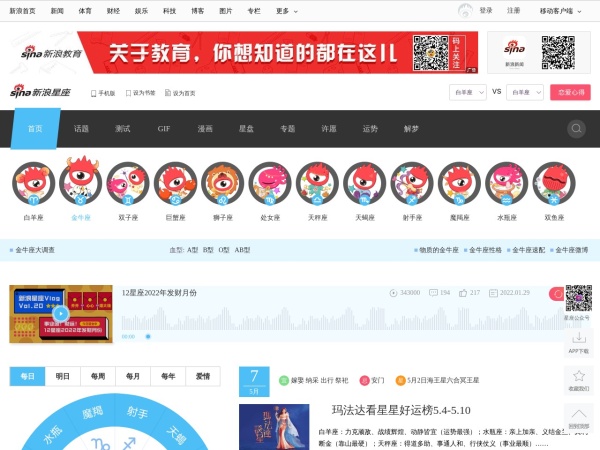 新浪星座-国内门户网站中第一个星座频道,自2000年创建以来竭诚提供12星座查询,配对,运势,日期,性格分析,心理测试,新闻资讯,是集专业,趣味,互动于一体的星座开放平台