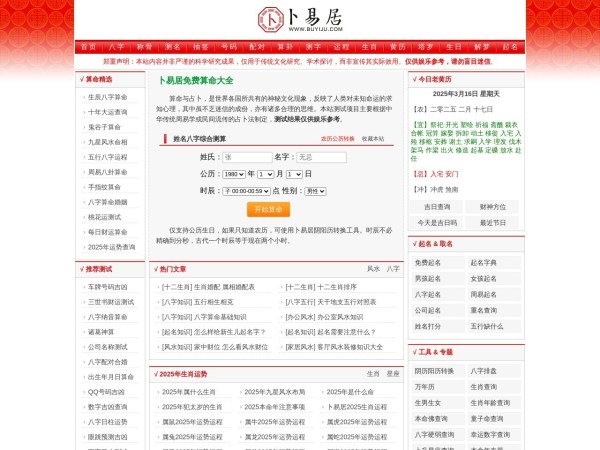 主要测算项目有生辰八字算命,姓名测试,在线算命,周易算命,在线抽签,姓名算命,起名网免费测名,在线算命,老黄历查询,周易占卜,八字算命婚姻,周公解梦,万年历,周易算卦,手机号码测吉凶,姓名配对,车牌号码吉凶,塔罗牌占卜,2025年生肖运程,宝宝起名打分,起名字大全等内容;