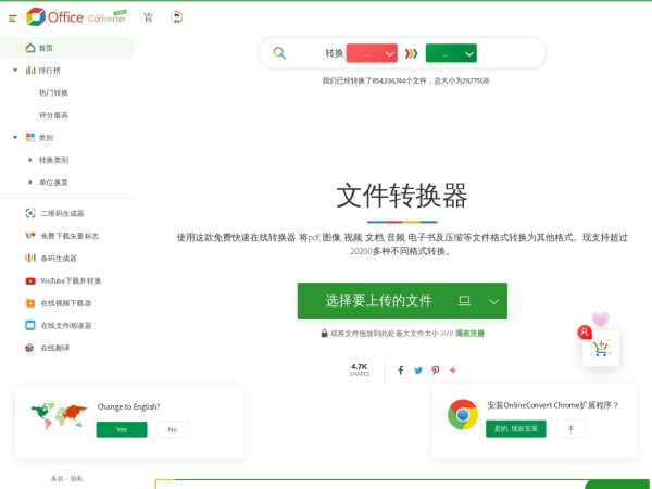 使用这款免费快速在线转换器. 将pdf, 图像, 视频, 文档, 音频, 电子书及压缩等文件格式转换为其他格式。现支持超过20200多种不同格式转换。