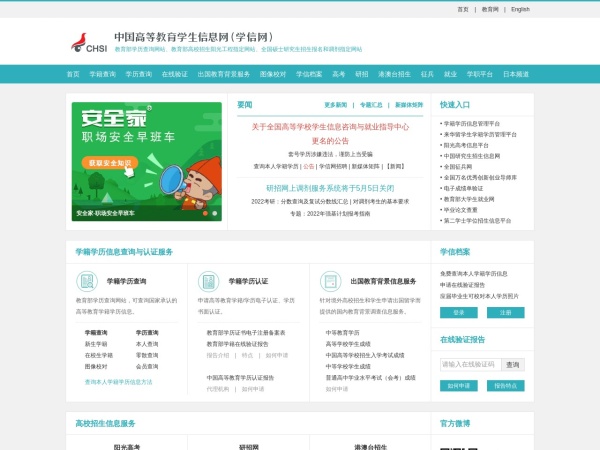 中国高等教育学生信息网(学信网)(全称:中国高等教育学生信息网(学信网))于2022年05月05日收录在本站在线教育分类目录,并成功建立了索引服务,供搜索引擎抓取/蜘蛛爬行/用户查找/检索服务;截至目前为止,本站已有 726个网友浏览了中国高等教育学生信息网(学信网)网站。
