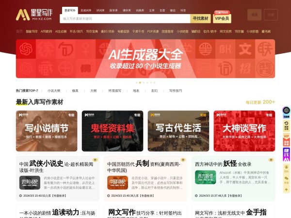 墨星写作网(原中国作者素材库)主要提供各类小说写作技巧学习,网文小说写作素材资料查阅以及各类写作辅助生成工具,致力于打造一站式专业网文小说写作辅助平台。