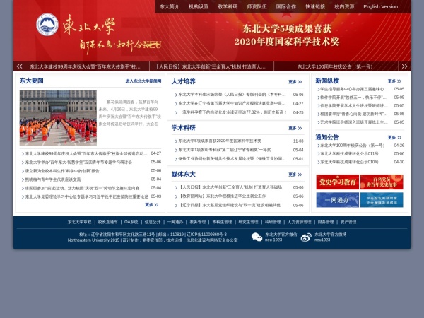 东北大学是教育部直属的国家重点大学,坐落在东北中心城市沈阳,是国家首批“211工程”和“985工程”重点建设的学校,并实现教育部、辽宁省、沈阳市重点共建。东北大学始建于1923年4月,是一所具有爱国主义光荣传统的大学。面向未来,东北大学将抓住机遇,办出特色,为建成“在中国新型工业化进程中起引领作用的“国内一流、国际知名”高水平研究型大学”而奋斗。