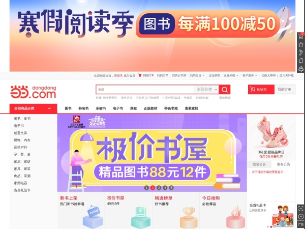 全球领先的综合性网上购物中心。超过100万种商品在线热销!图书、童书、绘本、中小学教辅、文学小说、音像、母婴、 家居、服装、鞋包等几十大类,正版保证,低至2折(自营图书满49元免运费。当当网一贯秉承提升顾客体验的承诺,自助 退换货便捷又放心)